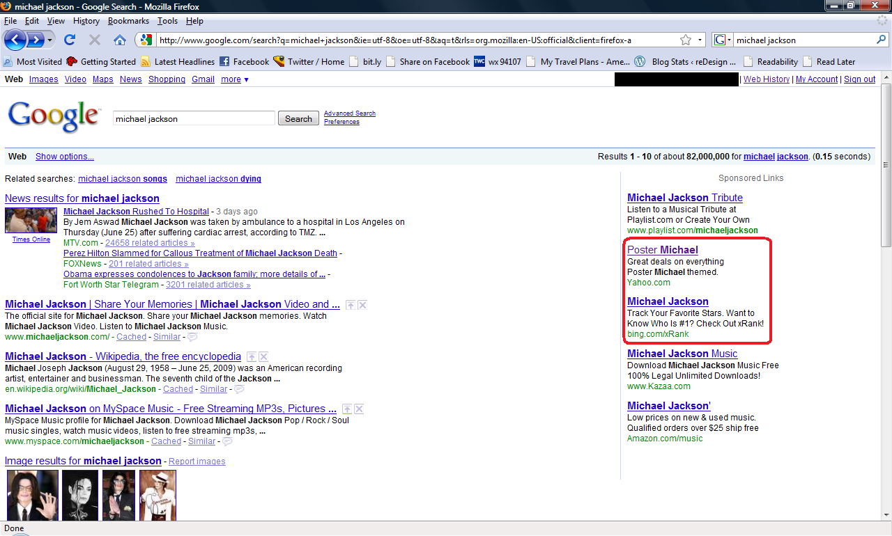 The bing ad led to bing’s xRank page for Michael Jackson. The Yahoo! ad bizarrely led to a Yahoo! shopping results page for Michael posters, most of which had nothing to do with Jackson.
